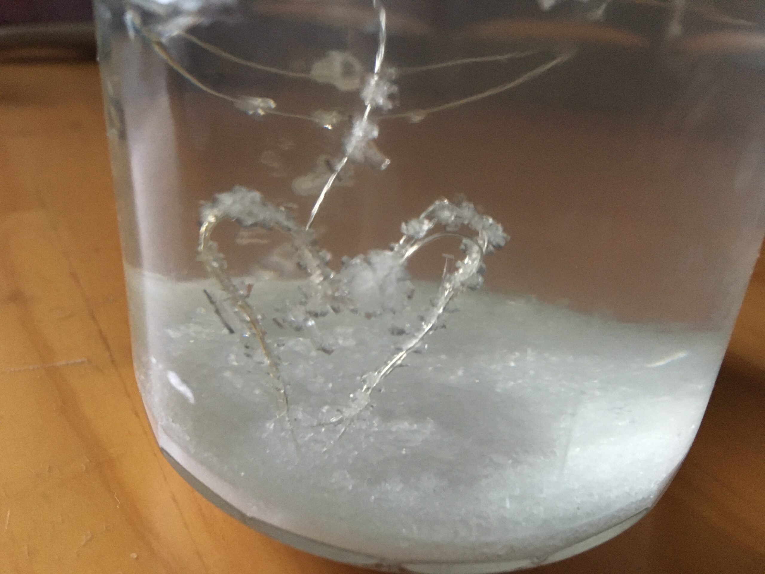 塩の結晶化実験をしてみています。塩水を沸騰させて、ゆっくりと冷ますと大きな結晶が出るようです。写真は作業翌日のもの。